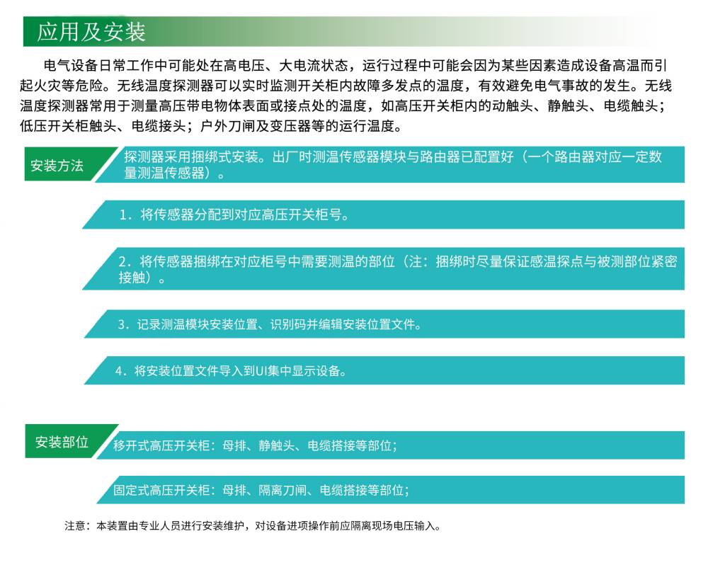 運行中的電氣系統用戶(包括高低壓配電柜用戶)需要一套預警系統,對各種原因導致的異常的溫度升高,進行實時監測,比如斷路器下的接點處,高壓觸頭處的溫度進行監測,并將溫度數據實時的上傳,并能夠通過手機等方式接收到報警信息,及時處理,從而避免火災事故的發生。